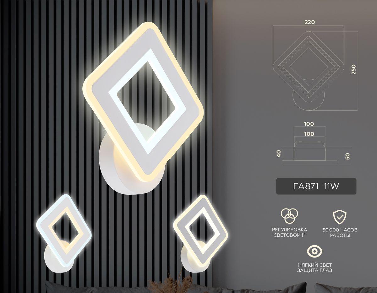 Перечислим технические характеристики Бра Ambrella Light Original FA871. Тип цоколя — LED. Общая мощность лампы — 11 Ватт. Высота люстры — 250 мм. Степень защиты — IP20, что обеспечивает защиту от проникновения предметов размером более 12 мм и защиту от капель воды, падающих под углом более 15 градусов. Бра Ambrella Light Original FA871 — часть коллекции Original. Плафон люстры имеет форму ромба и выполнен в белом цвете.