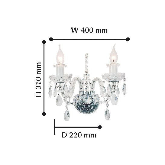 Перечислим технические характеристики Бра Favourite Lawanda 2022-2W. Тип цоколя — E14. Общая мощность лампы — 80 Ватт. Высота люстры — 310 мм. Степень защиты — IP20, что обеспечивает защиту от проникновения предметов размером более 12 мм и защиту от капель воды, падающих под углом более 15 градусов. Бра Favourite Lawanda 2022-2W — часть коллекции Lawanda. Плафон люстры имеет форму Без плафона и выполнен в цвете.