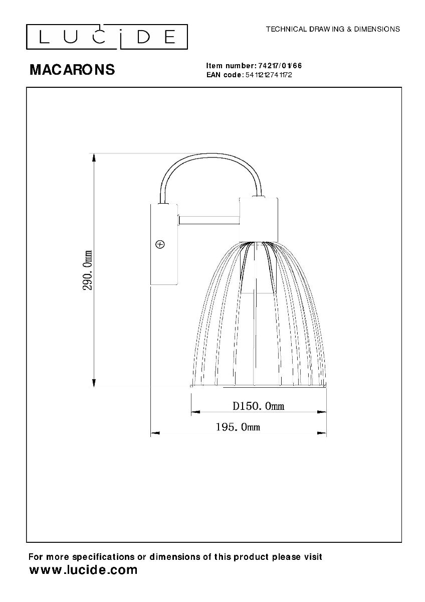 Перечислим технические характеристики Бра Lucide Macarons 74217/01/66. Тип цоколя — E27. Общая мощность лампы — 40 Ватт. Высота люстры — 290 мм. Степень защиты — IP20, что обеспечивает защиту от проникновения предметов размером более 12 мм и защиту от капель воды, падающих под углом более 15 градусов. Бра Lucide Macarons 74217/01/66 — часть коллекции Macarons. Плафон люстры имеет форму конуса и выполнен в розовом цвете.