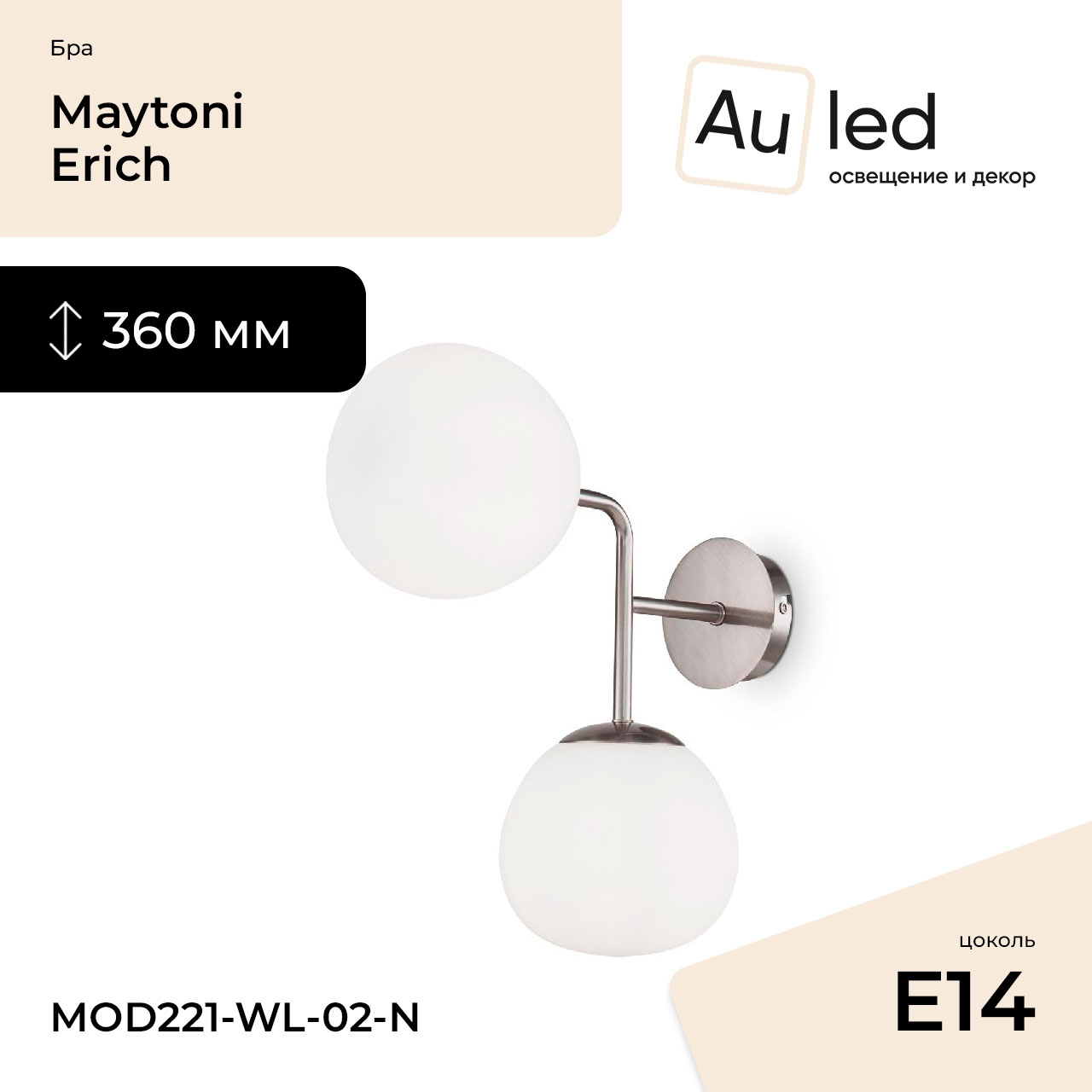 Перечислим технические характеристики Бра Maytoni Erich MOD221-WL-02-N. Тип цоколя — E14. Общая мощность лампы — 80 Ватт. Высота люстры — 360 мм. Степень защиты — IP20, что обеспечивает защиту от проникновения предметов размером более 12 мм и защиту от капель воды, падающих под углом более 15 градусов. Бра Maytoni Erich MOD221-WL-02-N — часть коллекции Erich. Плафон люстры имеет форму круга и выполнен в цвете.