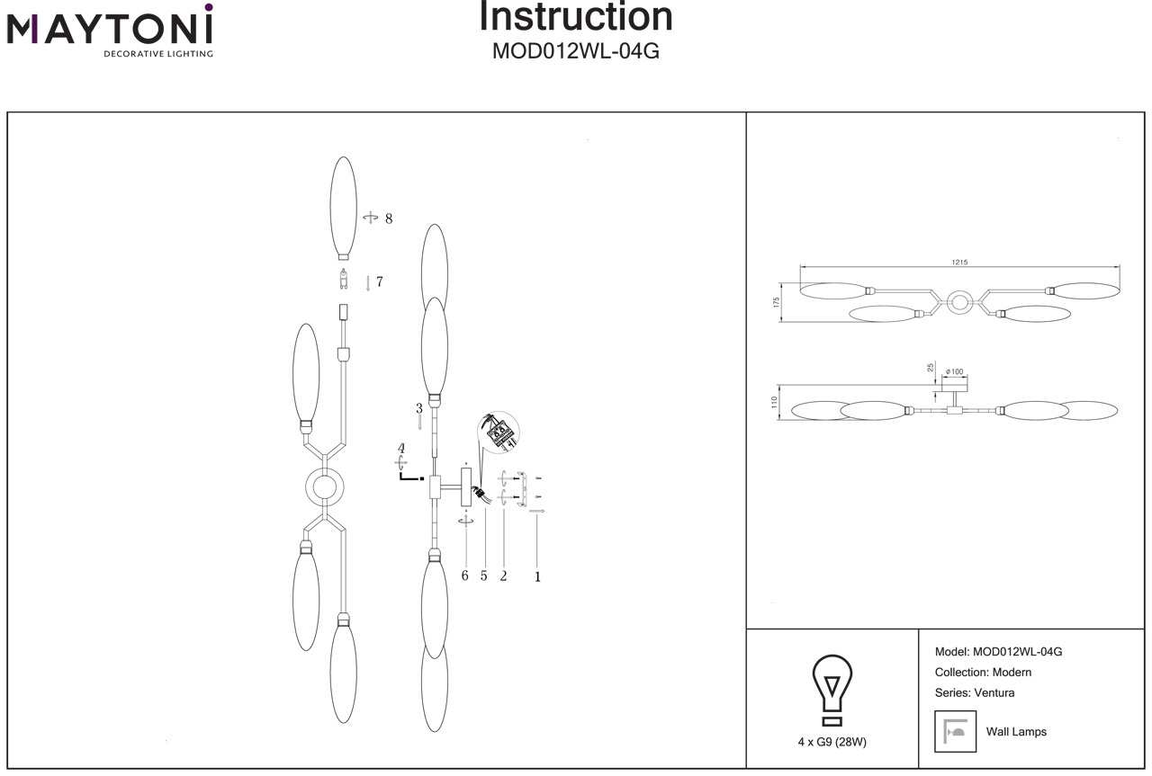 Перечислим технические характеристики Бра Maytoni Ventura MOD012WL-04G. Тип цоколя — G9. Общая мощность лампы — 112 Ватт. Высота люстры — 175 мм. Степень защиты — IP20, что обеспечивает защиту от проникновения предметов размером более 12 мм и защиту от капель воды, падающих под углом более 15 градусов. Бра Maytoni Ventura MOD012WL-04G — часть коллекции Ventura. Плафон люстры имеет форму овала и выполнен в цвете.