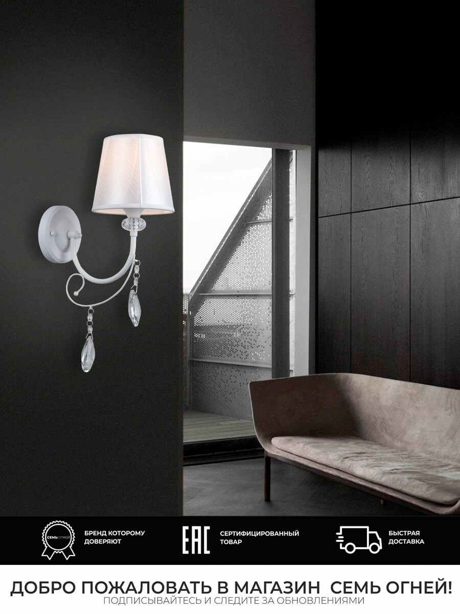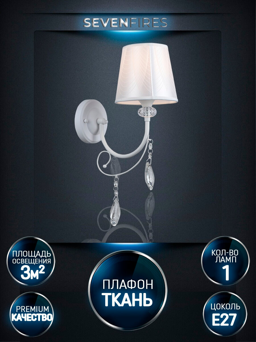 Перечислим технические характеристики Бра Seven Fires Zolin WD3587/1W-WT. Тип цоколя — E27. Общая мощность лампы — 60 Ватт. Высота люстры — 395 мм. Степень защиты — IP20, что обеспечивает защиту от проникновения предметов размером более 12 мм и защиту от капель воды, падающих под углом более 15 градусов. Бра Seven Fires Zolin WD3587/1W-WT — часть коллекции Zolin. Плафон люстры имеет форму абажура и выполнен в белом цвете.