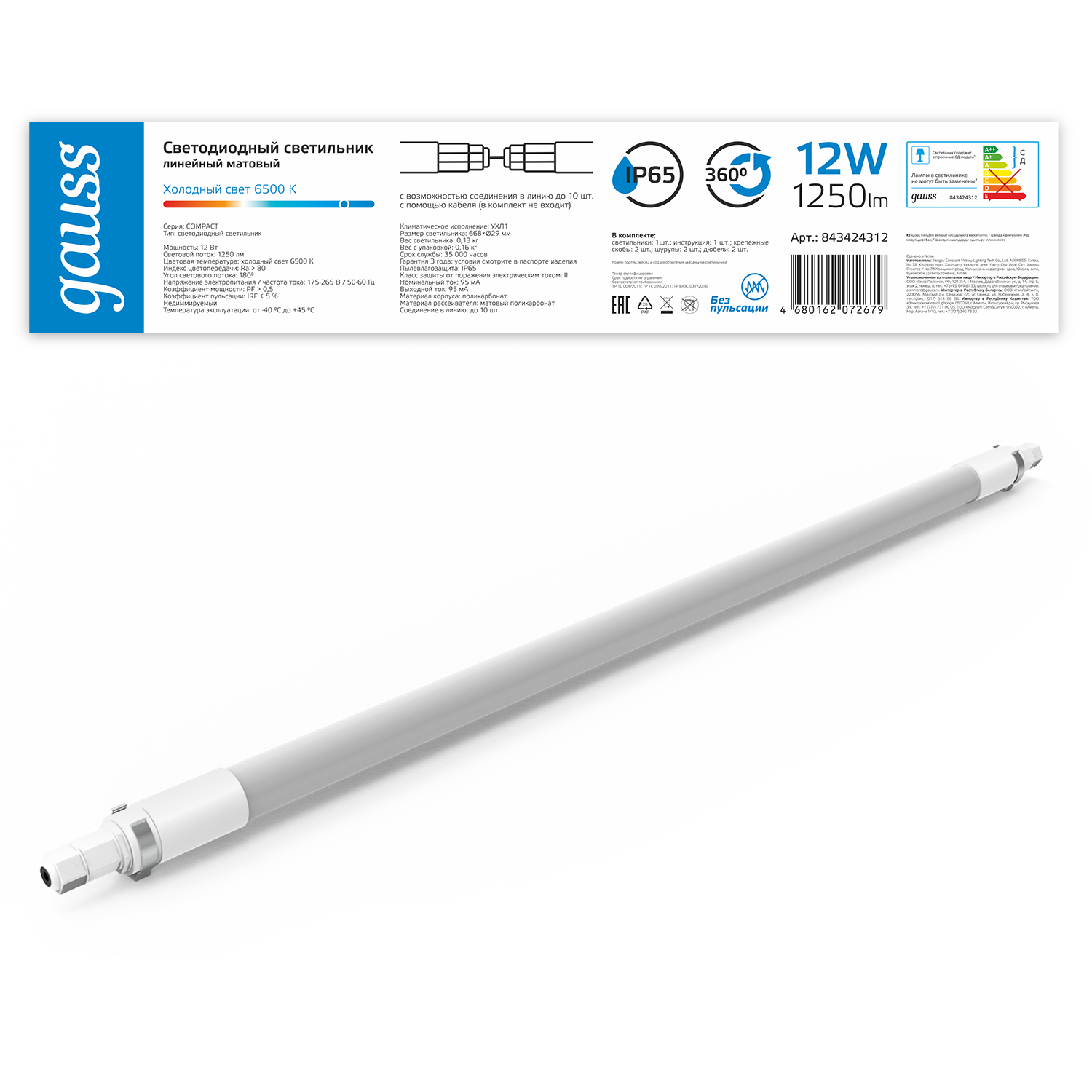 Перечислим технические характеристики Линейный потолочный светильник Gauss Compact 843424312. Тип цоколя — LED. Общая мощность лампы — 12 Ватт. Высота люстры — 29 мм. Степень защиты — IP65, что обеспечивает защиту от проникновения предметов размером более 12 мм и защиту от капель воды, падающих под углом более 15 градусов. Линейный потолочный светильник Gauss Compact 843424312 — часть коллекции Compact. Плафон люстры имеет форму цилиндра и выполнен в белом цвете.