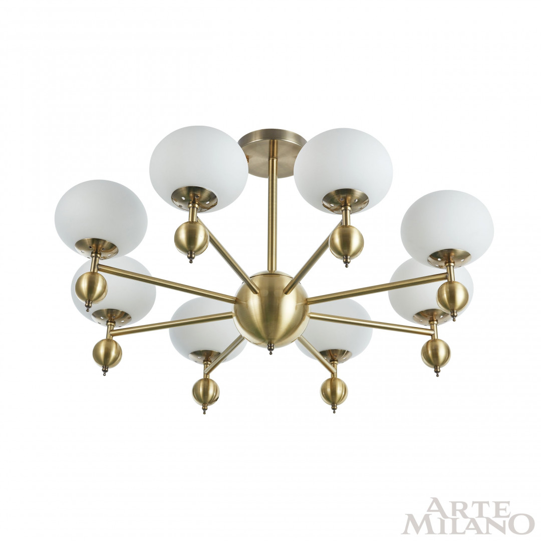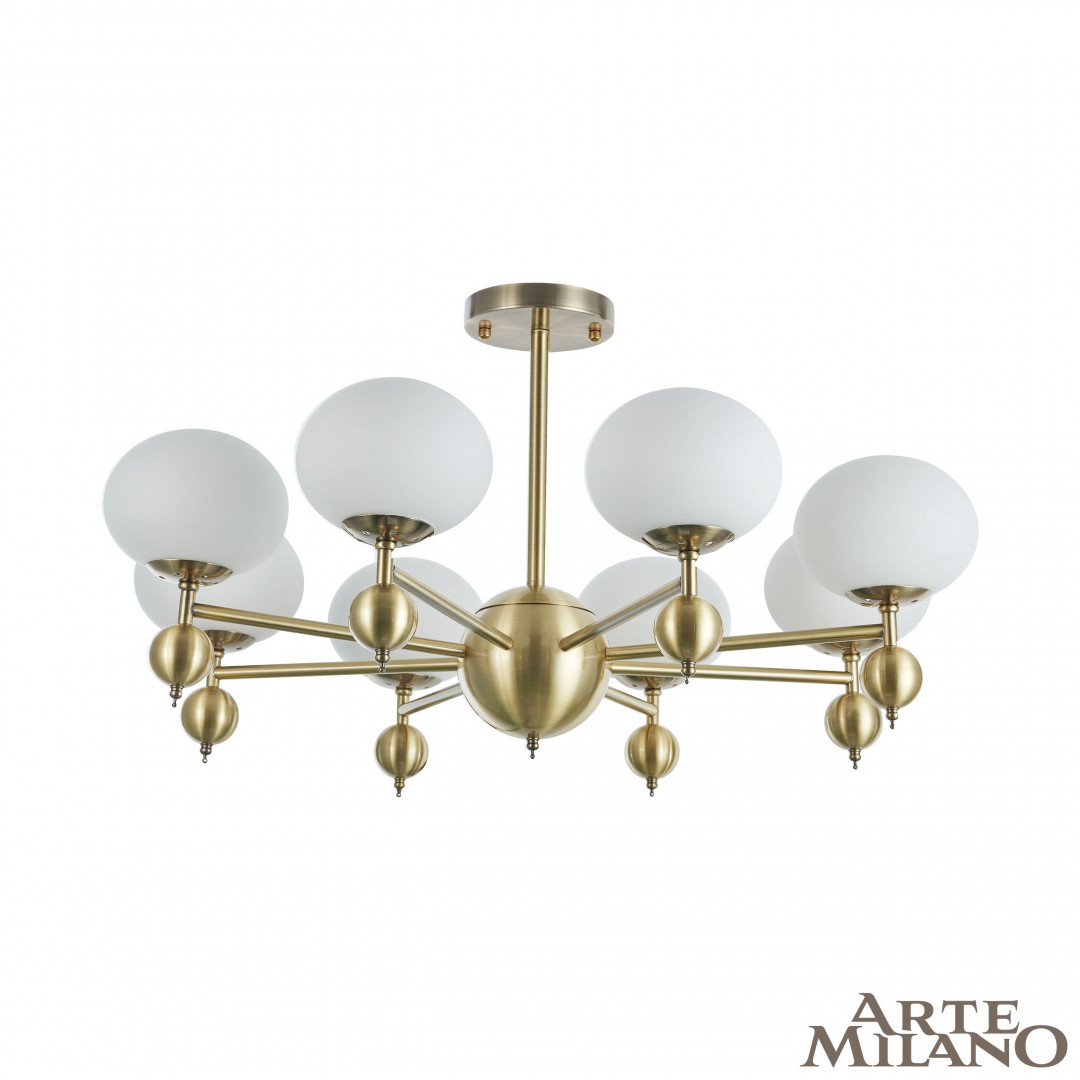 Перечислим технические характеристики люстры на штанге Arte Milano 270307/8 GD. Тип цоколя — E27. Общая мощность лампы — 320 Ватт. Высота люстры — 410 мм. Степень защиты — IP20, что обеспечивает защиту от проникновения предметов размером более 12 мм и защиту от капель воды, падающих под углом более 15 градусов. Люстра на штанге Arte Milano 270307/8 GD — часть коллекции . Плафон люстры имеет форму шара и выполнен в белом цвете.