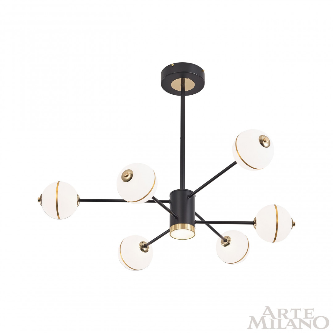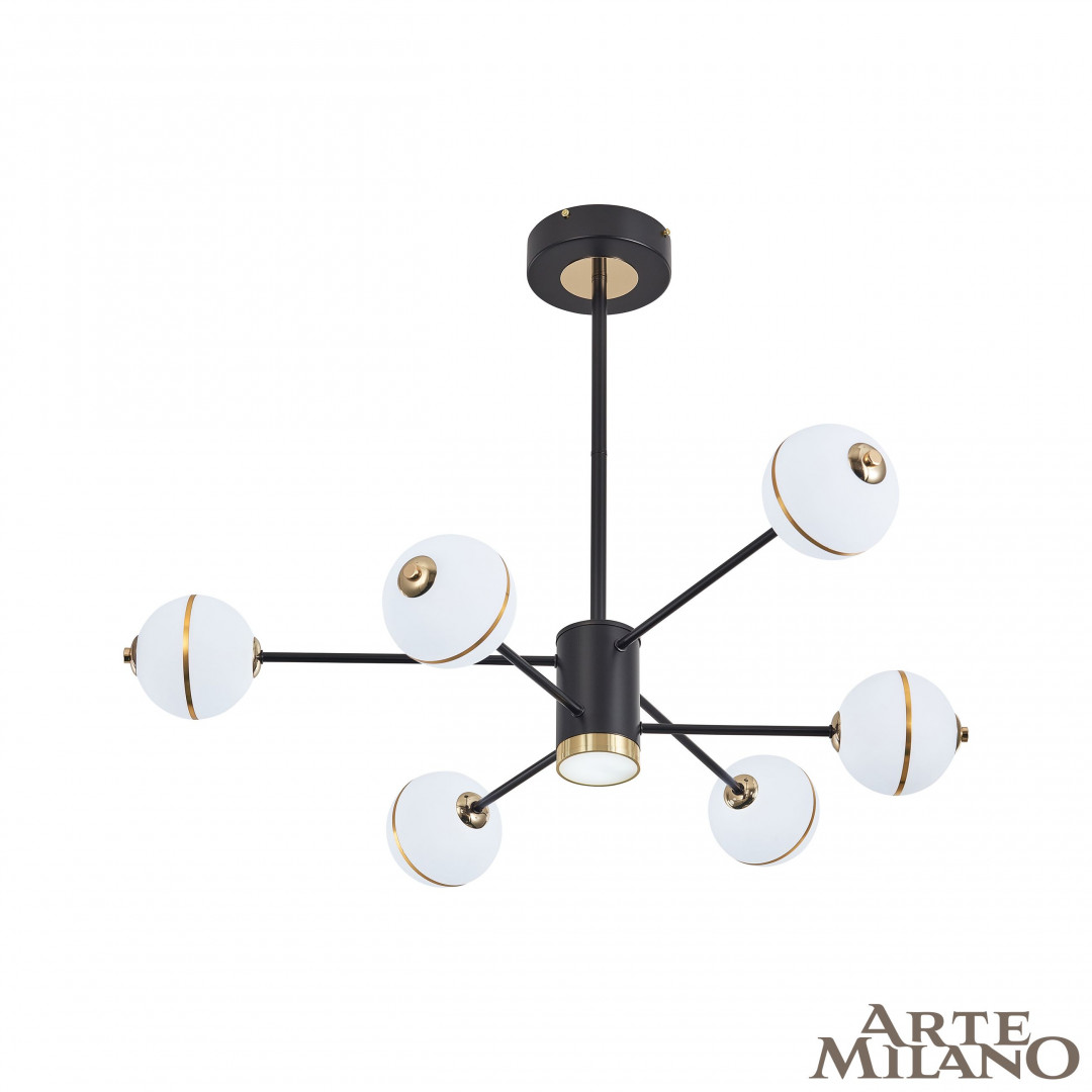 Перечислим технические характеристики люстры на штанге Arte Milano 272069/6 BK. Тип цоколя — LED. Общая мощность лампы — 108 Ватт. Высота люстры — 510 мм. Степень защиты — IP20, что обеспечивает защиту от проникновения предметов размером более 12 мм и защиту от капель воды, падающих под углом более 15 градусов. Люстра на штанге Arte Milano 272069/6 BK — часть коллекции . Плафон люстры имеет форму шара и выполнен в белом цвете.