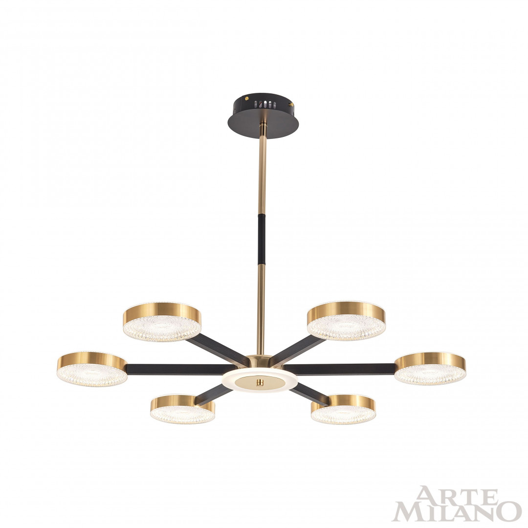 Перечислим технические характеристики люстры на штанге Arte Milano 272079/6 BK/GD. Тип цоколя — LED. Общая мощность лампы — 120 Ватт. Высота люстры — 620 мм. Степень защиты — IP20, что обеспечивает защиту от проникновения предметов размером более 12 мм и защиту от капель воды, падающих под углом более 15 градусов. Люстра на штанге Arte Milano 272079/6 BK/GD — часть коллекции . Плафон люстры имеет форму круга и выполнен в прозрачном цвете.
