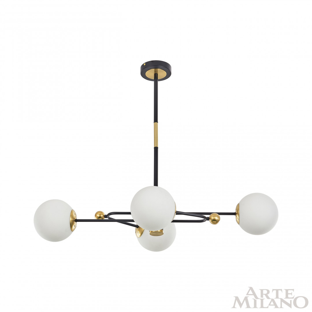 Перечислим технические характеристики люстры на штанге Arte Milano 272708/4 BK/GD. Тип цоколя — E27. Общая мощность лампы — 160 Ватт. Высота люстры — 630 мм. Степень защиты — IP20, что обеспечивает защиту от проникновения предметов размером более 12 мм и защиту от капель воды, падающих под углом более 15 градусов. Люстра на штанге Arte Milano 272708/4 BK/GD — часть коллекции . Плафон люстры имеет форму шара и выполнен в белом цвете.
