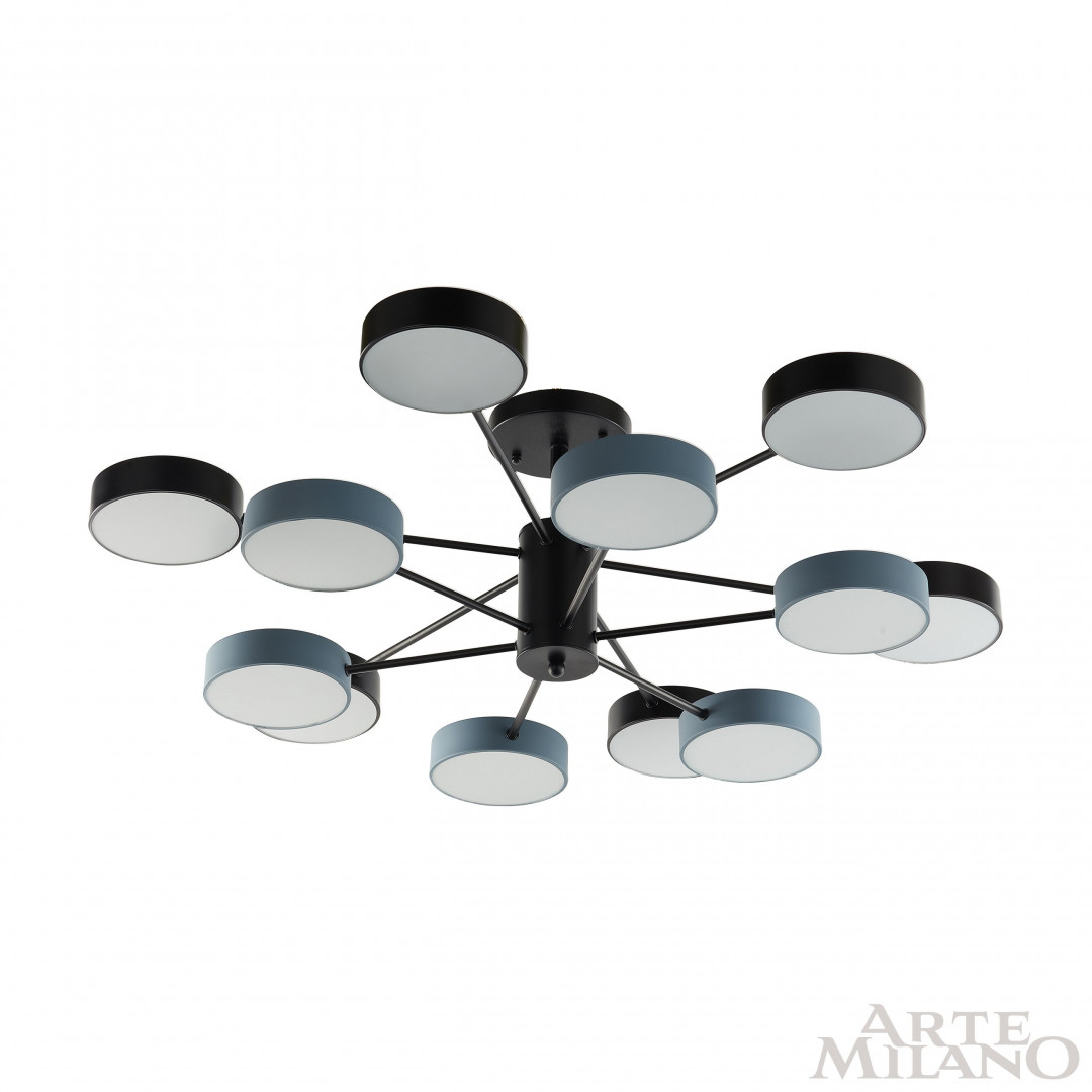 Перечислим технические характеристики люстры на штанге Arte Milano Ferrara 250906/12B Bk/Gr. Тип цоколя — LED. Общая мощность лампы — 144 Ватт. Высота люстры — 280 мм. Степень защиты — IP20, что обеспечивает защиту от проникновения предметов размером более 12 мм и защиту от капель воды, падающих под углом более 15 градусов. Люстра на штанге Arte Milano Ferrara 250906/12B Bk/Gr — часть коллекции FERRARA. Плафон люстры имеет форму круга и выполнен в белом цвете.