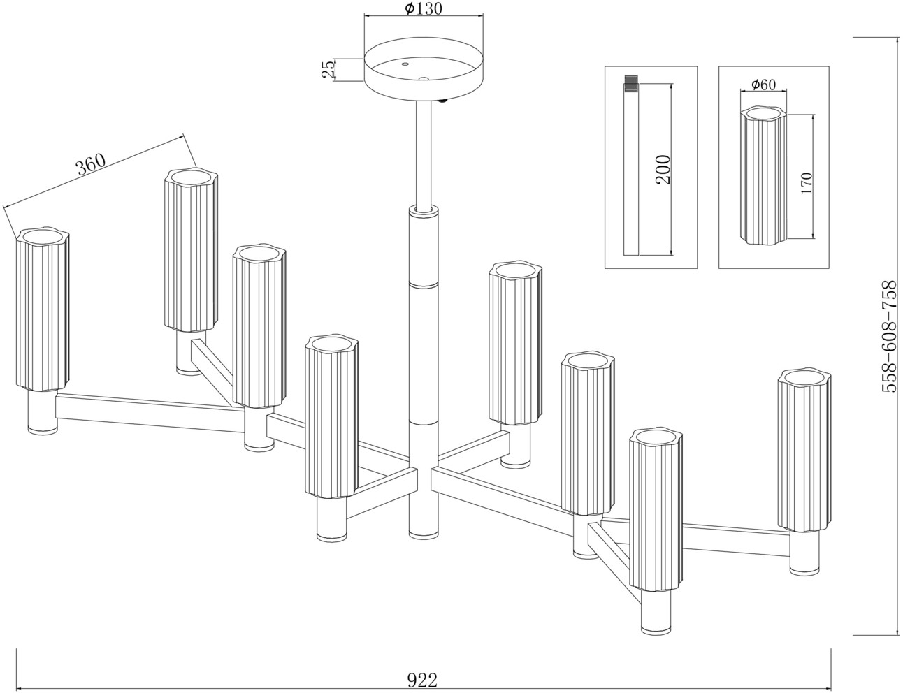 Перечислим технические характеристики люстры на штанге Freya Ambra FR5167PL-08BS. Тип цоколя — E14. Общая мощность лампы — 320 Ватт. Высота люстры — 558 мм. Степень защиты — IP20, что обеспечивает защиту от проникновения предметов размером более 12 мм и защиту от капель воды, падающих под углом более 15 градусов. Люстра на штанге Freya Ambra FR5167PL-08BS — часть коллекции Ambra. Плафон люстры имеет форму цилиндра и выполнен в прозрачном цвете.