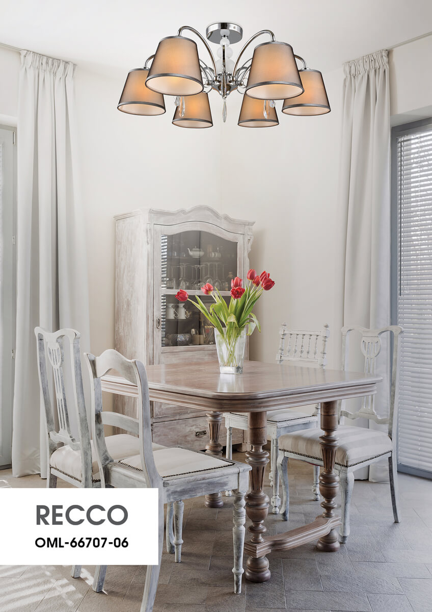 Перечислим технические характеристики люстры на штанге Omnilux OML-66707-06. Тип цоколя — E14. Общая мощность лампы — 240 Ватт. Высота люстры — 270 мм. Степень защиты — IP20, что обеспечивает защиту от проникновения предметов размером более 12 мм и защиту от капель воды, падающих под углом более 15 градусов. Люстра на штанге Omnilux OML-66707-06 — часть коллекции Recco. Плафон люстры имеет форму конуса и выполнен в сером цвете.