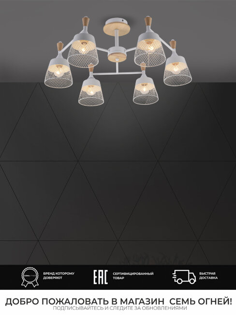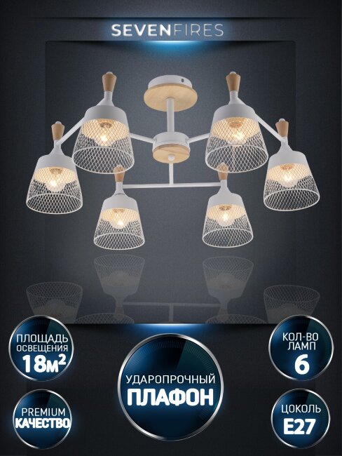 Перечислим технические характеристики люстры на штанге Seven Fires Laurens SF3386/6C-WT-WD. Тип цоколя — E27. Общая мощность лампы — 360 Ватт. Высота люстры — 280 мм. Степень защиты — IP20, что обеспечивает защиту от проникновения предметов размером более 12 мм и защиту от капель воды, падающих под углом более 15 градусов. Люстра на штанге Seven Fires Laurens SF3386/6C-WT-WD — часть коллекции Laurens. Плафон люстры имеет форму конуса и выполнен в белом цвете.