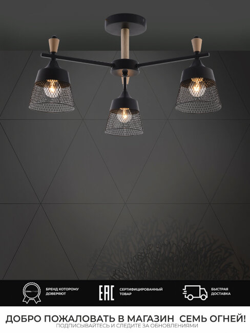 Перечислим технические характеристики люстры на штанге Seven Fires Olban SF3389/3C-BK-WD. Тип цоколя — E27. Общая мощность лампы — 180 Ватт. Высота люстры — 290 мм. Степень защиты — IP20, что обеспечивает защиту от проникновения предметов размером более 12 мм и защиту от капель воды, падающих под углом более 15 градусов. Люстра на штанге Seven Fires Olban SF3389/3C-BK-WD — часть коллекции Olban. Плафон люстры имеет форму конуса и выполнен в черном цвете.