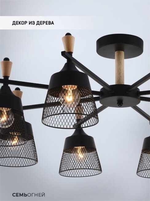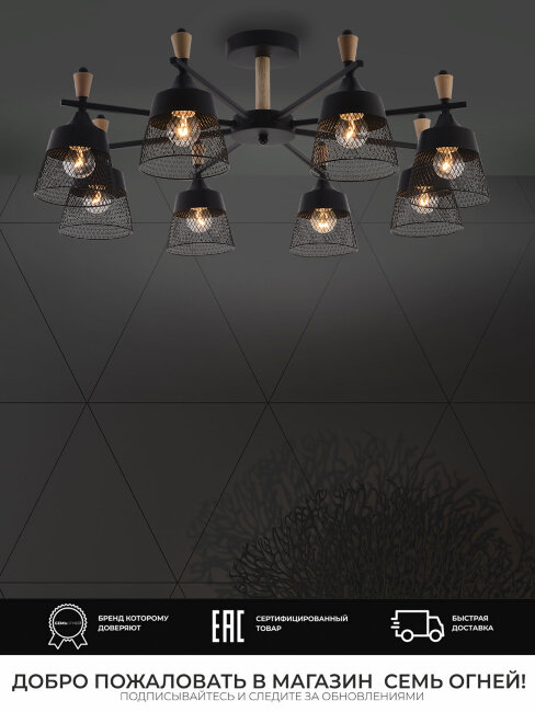 Перечислим технические характеристики люстры на штанге Seven Fires Olban SF3389/8C-BK-WD. Тип цоколя — E27. Общая мощность лампы — 480 Ватт. Высота люстры — 280 мм. Степень защиты — IP20, что обеспечивает защиту от проникновения предметов размером более 12 мм и защиту от капель воды, падающих под углом более 15 градусов. Люстра на штанге Seven Fires Olban SF3389/8C-BK-WD — часть коллекции Olban. Плафон люстры имеет форму конуса и выполнен в черном цвете.