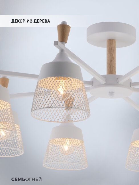 Перечислим технические характеристики люстры на штанге Seven Fires Olban SF3389/8C-WT-WD. Тип цоколя — E27. Общая мощность лампы — 480 Ватт. Высота люстры — 280 мм. Степень защиты — IP20, что обеспечивает защиту от проникновения предметов размером более 12 мм и защиту от капель воды, падающих под углом более 15 градусов. Люстра на штанге Seven Fires Olban SF3389/8C-WT-WD — часть коллекции Olban. Плафон люстры имеет форму конуса и выполнен в белом цвете.