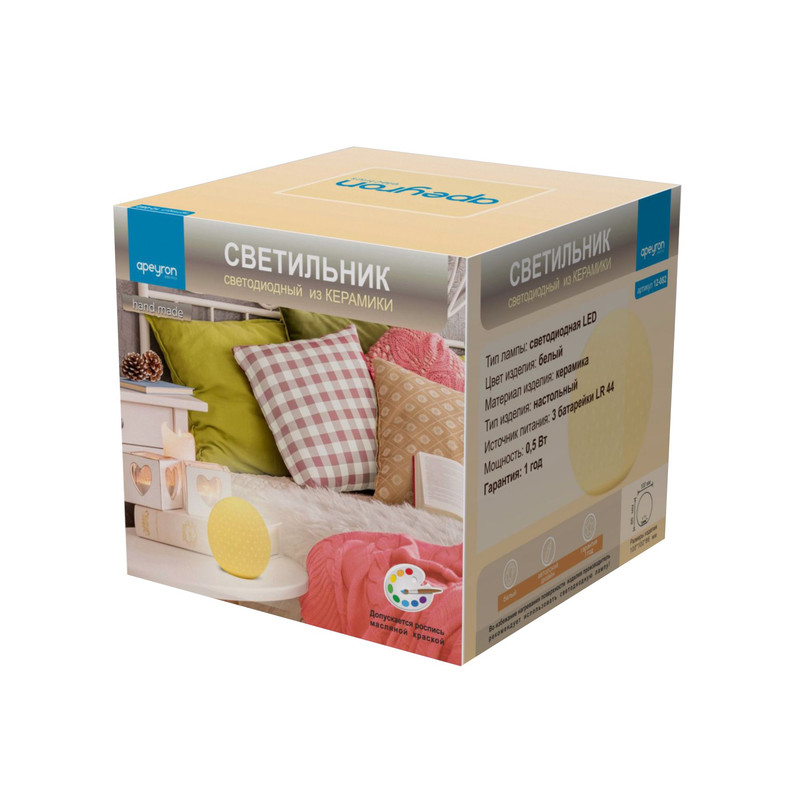 Перечислим технические характеристики настольной лампы Apeyron 12-082. Тип цоколя — E14. Общая мощность лампы — 25 Ватт. Высота люстры — 85 мм. Степень защиты — IP20, что обеспечивает защиту от проникновения предметов размером более 12 мм и защиту от капель воды, падающих под углом более 15 градусов. Настольная лампа Apeyron 12-082 — часть коллекции . Плафон люстры имеет форму шара и выполнен в белом цвете.