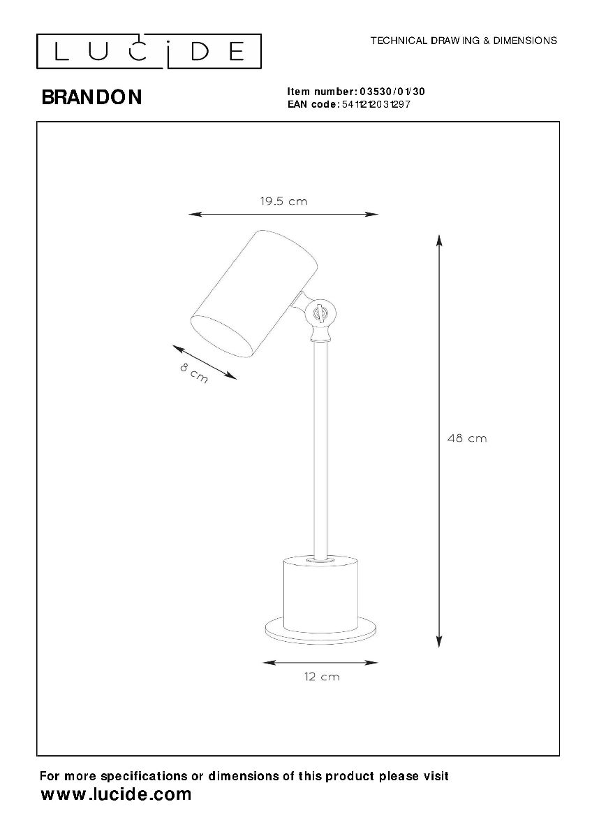 Перечислим технические характеристики настольной лампы Lucide Brandon 03530/01/30. Тип цоколя — E14. Общая мощность лампы — 40 Ватт. Высота люстры — 480 мм. Степень защиты — IP20, что обеспечивает защиту от проникновения предметов размером более 12 мм и защиту от капель воды, падающих под углом более 15 градусов. Настольная лампа Lucide Brandon 03530/01/30 — часть коллекции BRANDON. Плафон люстры имеет форму цилиндра и выполнен в черном цвете.