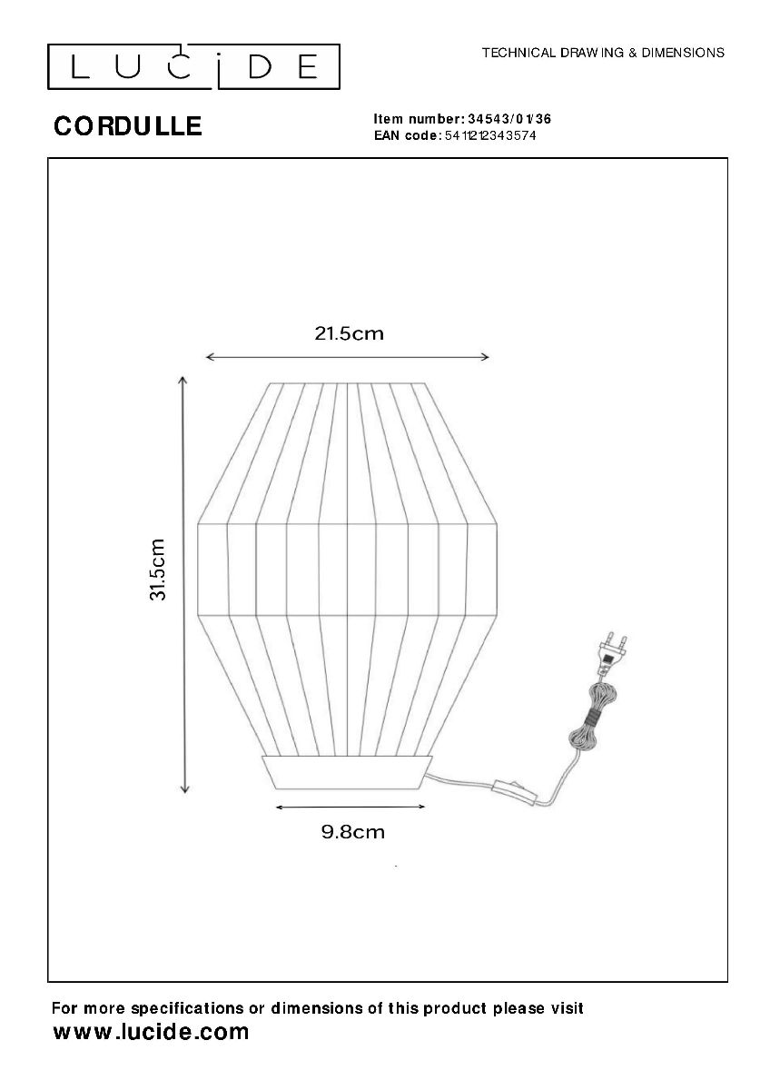 Перечислим технические характеристики настольной лампы Lucide Cordulle 34543/01/36. Тип цоколя — E27. Общая мощность лампы — 40 Ватт. Высота люстры — 335 мм. Степень защиты — IP20, что обеспечивает защиту от проникновения предметов размером более 12 мм и защиту от капель воды, падающих под углом более 15 градусов. Настольная лампа Lucide Cordulle 34543/01/36 — часть коллекции Cordulle. Плафон люстры имеет форму овала и выполнен в сером цвете.