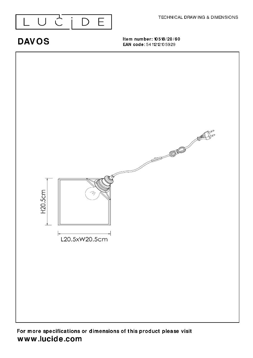 Перечислим технические характеристики настольной лампы Lucide Davos 10518/20/60. Тип цоколя — E27. Общая мощность лампы — 60 Ватт. Высота люстры — 200 мм. Степень защиты — IP20, что обеспечивает защиту от проникновения предметов размером более 12 мм и защиту от капель воды, падающих под углом более 15 градусов. Настольная лампа Lucide Davos 10518/20/60 — часть коллекции Davos. Плафон люстры имеет форму призмы и выполнен в прозрачном цвете.