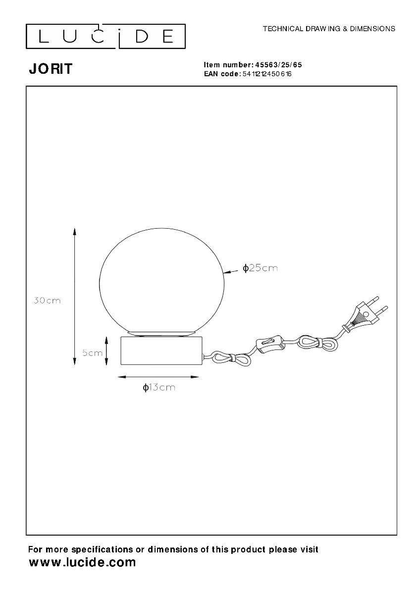 Перечислим технические характеристики настольной лампы Lucide Jorit 45563/25/65. Тип цоколя — E27. Общая мощность лампы — 60 Ватт. Высота люстры — 300 мм. Степень защиты — IP20, что обеспечивает защиту от проникновения предметов размером более 12 мм и защиту от капель воды, падающих под углом более 15 градусов. Настольная лампа Lucide Jorit 45563/25/65 — часть коллекции Jorit. Плафон люстры имеет форму шара и выполнен в сером цвете.