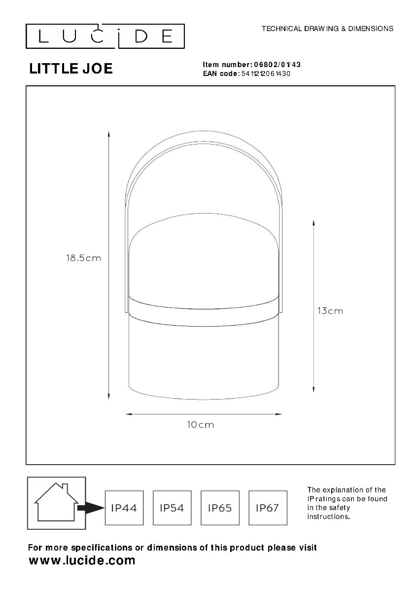 Перечислим технические характеристики настольной лампы Lucide Little Joe 06802/01/43. Тип цоколя — LED. Общая мощность лампы — 3 Ватт. Высота люстры — 185 мм. Степень защиты — IP44, что обеспечивает защиту от проникновения предметов размером более 12 мм и защиту от капель воды, падающих под углом более 15 градусов. Настольная лампа Lucide Little Joe 06802/01/43 — часть коллекции Little Joe. Плафон люстры имеет форму цилиндра и выполнен в белом цвете.