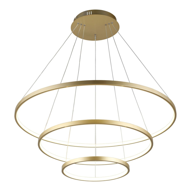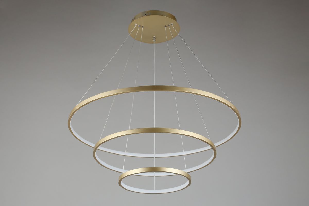 Перечислим технические характеристики подвесной люстры Aployt Lunet APL.014.03.100. Тип цоколя — LED. Общая мощность лампы — 100 Ватт. Высота люстры — 1500 мм. Степень защиты — IP20, что обеспечивает защиту от проникновения предметов размером более 12 мм и защиту от капель воды, падающих под углом более 15 градусов. Подвесная люстра Aployt Lunet APL.014.03.100 — часть коллекции Lunet. Плафон люстры имеет форму кольца и выполнен в Золото цвете.