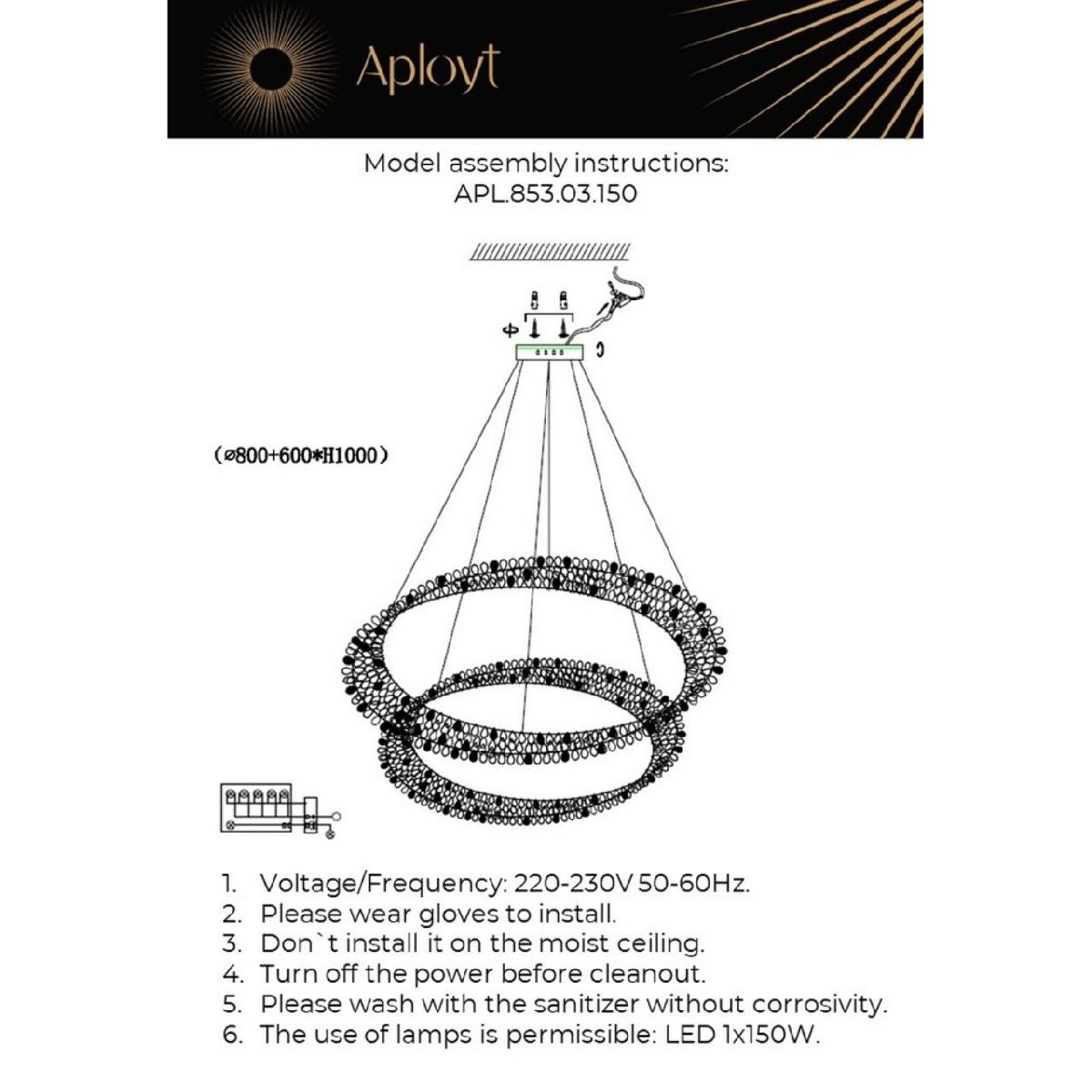 Перечислим технические характеристики подвесной люстры Aployt Marcelina APL.853.03.150. Тип цоколя — LED. Общая мощность лампы — 150 Ватт. Высота люстры — 1000 мм. Степень защиты — IP20, что обеспечивает защиту от проникновения предметов размером более 12 мм и защиту от капель воды, падающих под углом более 15 градусов. Подвесная люстра Aployt Marcelina APL.853.03.150 — часть коллекции Marcelina. Плафон люстры имеет форму кольца и выполнен в прозрачном цвете.