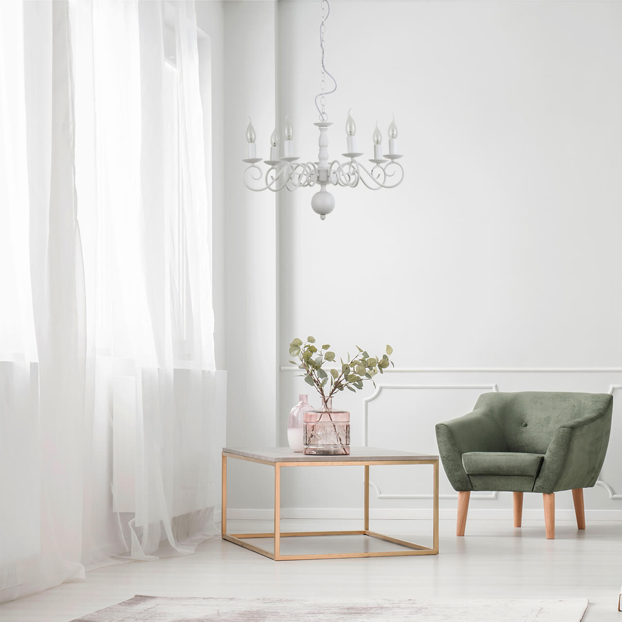 Перечислим технические характеристики подвесной люстры Arte Lamp A1129LM-7WH. Тип цоколя — E14. Общая мощность лампы — 280 Ватт. Высота люстры — 350 мм. Степень защиты — IP20, что обеспечивает защиту от проникновения предметов размером более 12 мм и защиту от капель воды, падающих под углом более 15 градусов. Подвесная люстра Arte Lamp A1129LM-7WH — часть коллекции Isabel. Плафон люстры имеет форму Без плафона и выполнен в цвете.