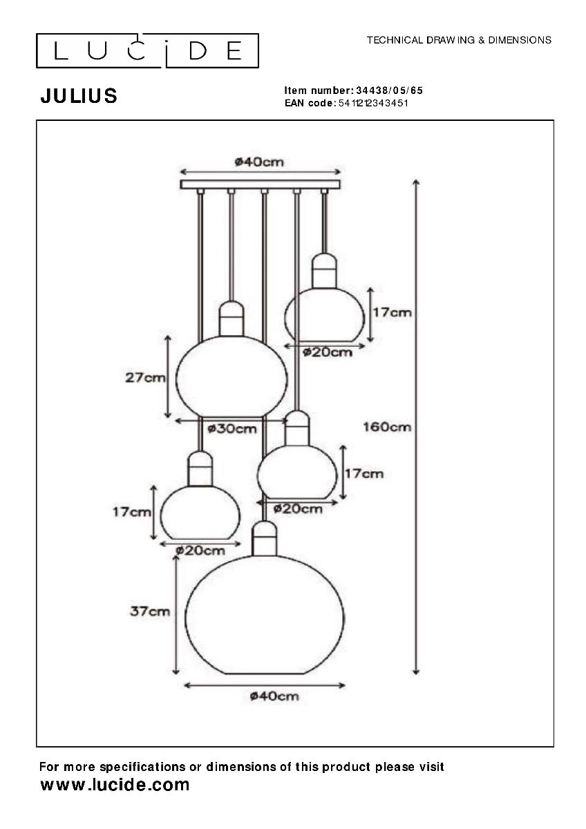 Перечислим технические характеристики подвесной люстры Lucide Julius 34438/05/65. Тип цоколя — E27. Общая мощность лампы — 200 Ватт. Высота люстры — 1600 мм. Степень защиты — IP20, что обеспечивает защиту от проникновения предметов размером более 12 мм и защиту от капель воды, падающих под углом более 15 градусов. Подвесная люстра Lucide Julius 34438/05/65 — часть коллекции Julius. Плафон люстры имеет форму шара и выполнен в сером цвете.