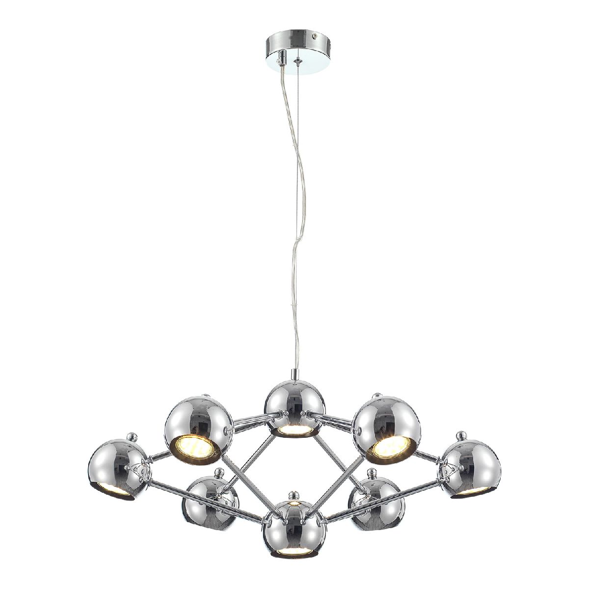 Перечислим технические характеристики подвесной люстры Lussole LSP-8898. Тип цоколя — GU10. Общая мощность лампы — 400 Ватт. Высота люстры — 1000 мм. Степень защиты — IP20, что обеспечивает защиту от проникновения предметов размером более 12 мм и защиту от капель воды, падающих под углом более 15 градусов. Подвесная люстра Lussole LSP-8898 — часть коллекции . Плафон люстры имеет форму шара и выполнен в Хром цвете.