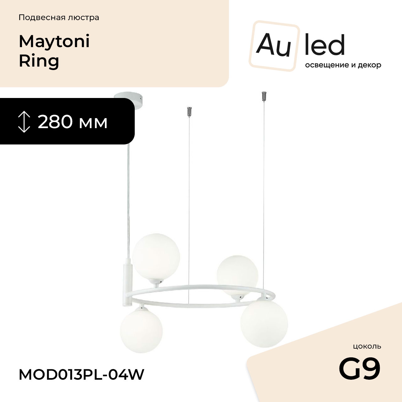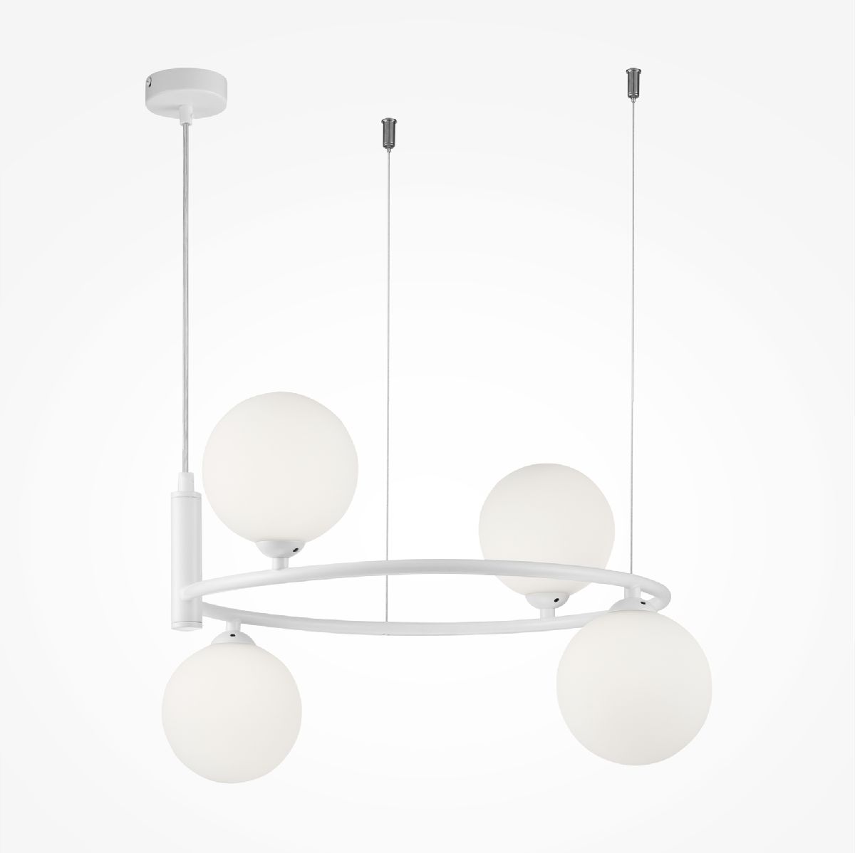 Перечислим технические характеристики подвесной люстры Maytoni Ring MOD013PL-04W. Тип цоколя — G9. Общая мощность лампы — 100 Ватт. Высота люстры — 280 мм. Степень защиты — IP20, что обеспечивает защиту от проникновения предметов размером более 12 мм и защиту от капель воды, падающих под углом более 15 градусов. Подвесная люстра Maytoni Ring MOD013PL-04W — часть коллекции Ring. Плафон люстры имеет форму шара и выполнен в белом цвете.
