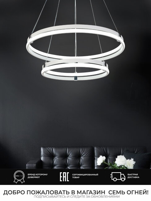 Перечислим технические характеристики подвесной люстры Seven Fires Liven SF5023/2P-CR-WT. Тип цоколя — LED. Общая мощность лампы — 226 Ватт. Высота люстры — 1000 мм. Степень защиты — IP20, что обеспечивает защиту от проникновения предметов размером более 12 мм и защиту от капель воды, падающих под углом более 15 градусов. Подвесная люстра Seven Fires Liven SF5023/2P-CR-WT — часть коллекции Liven. Плафон люстры имеет форму кольца и выполнен в белом цвете.