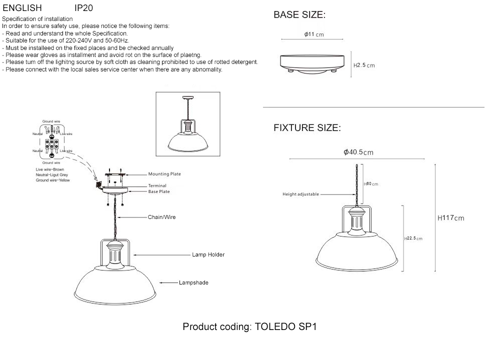 Перечислим технические характеристики подвесного светильника Crystal Lux TOLEDO SP1 V2 BROWN. Тип цоколя — E27. Общая мощность лампы — 60 Ватт. Высота люстры — 1170 мм. Степень защиты — , что обеспечивает защиту от проникновения предметов размером более 12 мм и защиту от капель воды, падающих под углом более 15 градусов. Подвесной светильник Crystal Lux TOLEDO SP1 V2 BROWN — часть коллекции Toledo. Плафон люстры имеет форму полукруга и выполнен в коричневом цвете.
