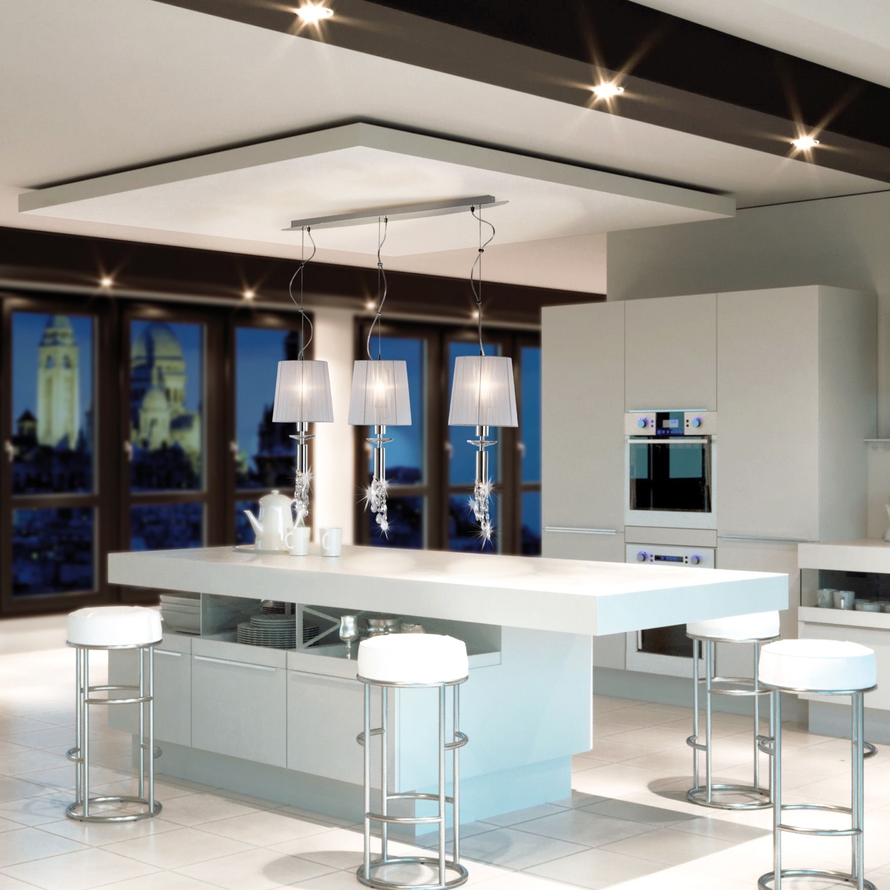 Перечислим технические характеристики подвесного светильника Mantra Tiffany 3855. Тип цоколя — E27. Общая мощность лампы — 75 Ватт. Высота люстры — 455 мм. Степень защиты — IP20, что обеспечивает защиту от проникновения предметов размером более 12 мм и защиту от капель воды, падающих под углом более 15 градусов. Подвесной светильник Mantra Tiffany 3855 — часть коллекции Tiffany. Плафон люстры имеет форму конуса и выполнен в белом цвете.