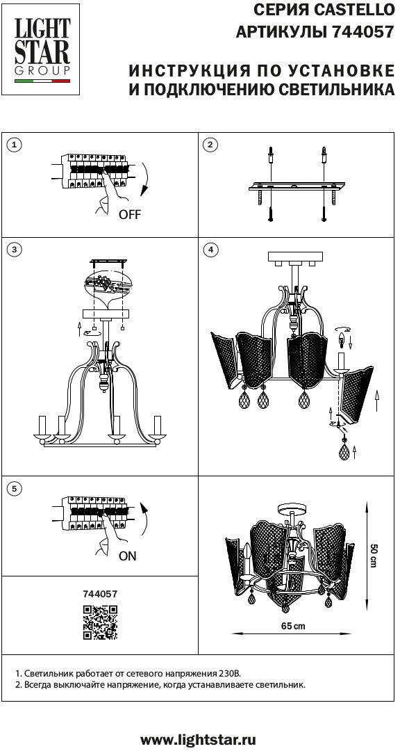 Перечислим технические характеристики потолочной люстры Lightstar Castello 744057. Тип цоколя — E14. Общая мощность лампы — 200 Ватт. Высота люстры — 500 мм. Степень защиты — IP20, что обеспечивает защиту от проникновения предметов размером более 12 мм и защиту от капель воды, падающих под углом более 15 градусов. Потолочная люстра Lightstar Castello 744057 — часть коллекции Castello. Плафон люстры имеет форму Декоративный и выполнен в черном цвете.