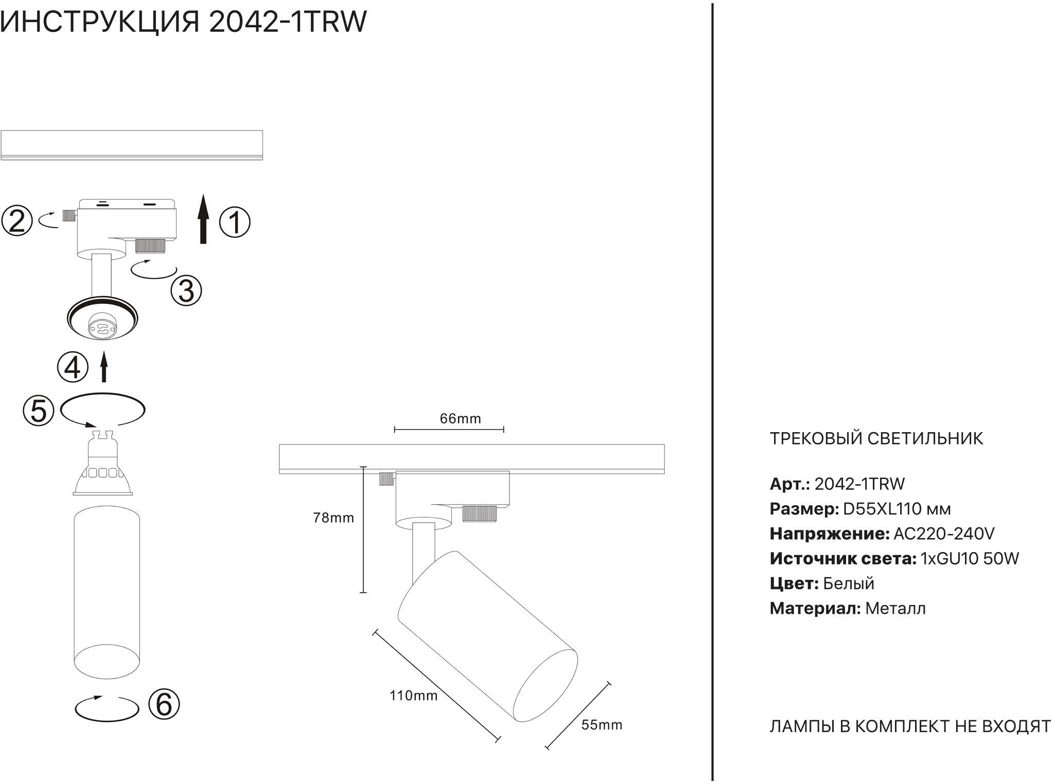 Перечислим технические характеристики трекового светильника Simple Story 2042-1TRW. Тип цоколя — GU10. Общая мощность лампы — 50 Ватт. Высота люстры — 188 мм. Степень защиты — IP20, что обеспечивает защиту от проникновения предметов размером более 12 мм и защиту от капель воды, падающих под углом более 15 градусов. Трековый светильник Simple Story 2042-1TRW — часть коллекции 2042. Плафон люстры имеет форму цилиндра и выполнен в белом цвете.