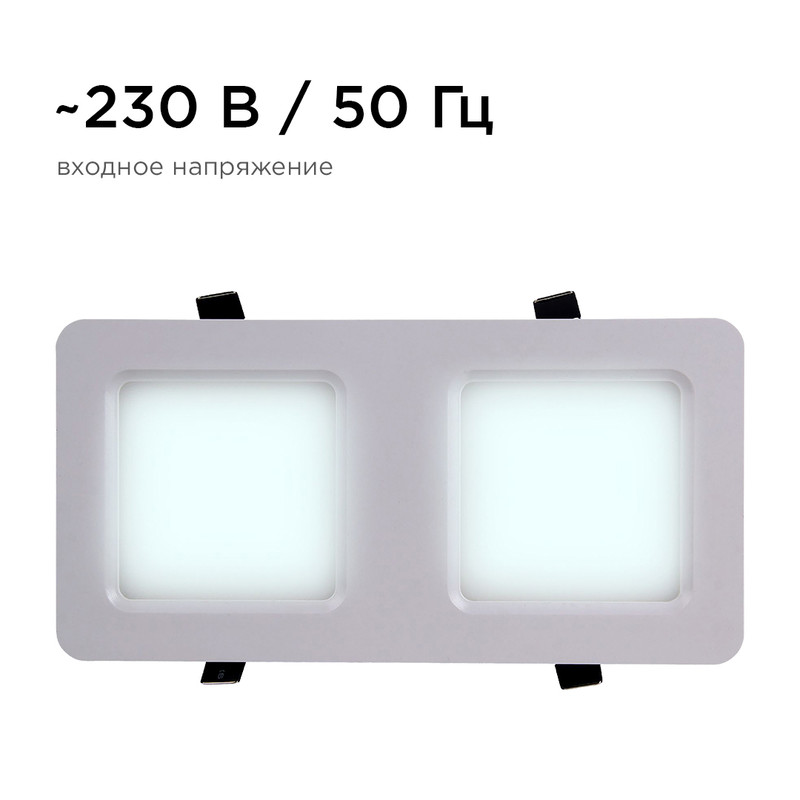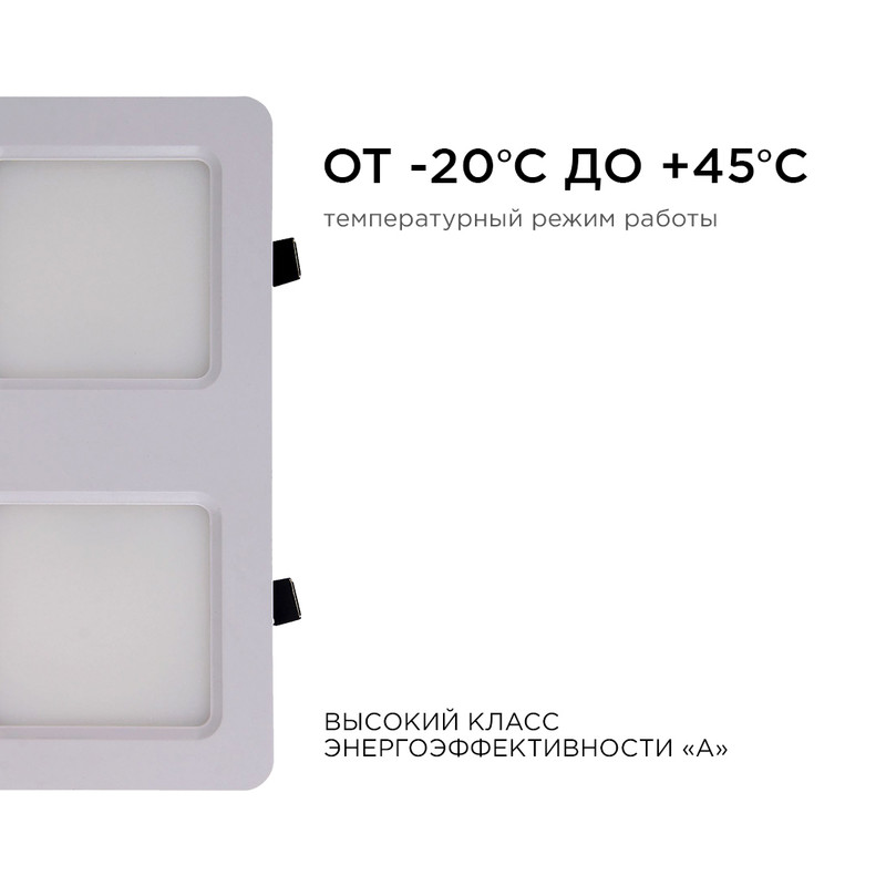 Перечислим технические характеристики встраиваемого светильника Apeyron Грильято 42-018. Тип цоколя — LED. Общая мощность лампы — 24 Ватт. Высота люстры — 27 мм. Степень защиты — IP20, что обеспечивает защиту от проникновения предметов размером более 12 мм и защиту от капель воды, падающих под углом более 15 градусов. Встраиваемый светильник Apeyron Грильято 42-018 — часть коллекции Грильято. Плафон люстры имеет форму Прямоугольный и выполнен в белом цвете.