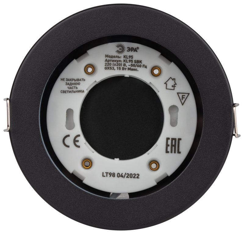 Перечислим технические характеристики встраиваемого светильника Эра KL95 SBK Б0055812. Тип цоколя — GX53. Общая мощность лампы — 15 Ватт. Высота люстры — 55 мм. Степень защиты — IP44, что обеспечивает защиту от проникновения предметов размером более 12 мм и защиту от капель воды, падающих под углом более 15 градусов. Встраиваемый светильник Эра KL95 SBK Б0055812 — часть коллекции KL95. Плафон люстры имеет форму круга и выполнен в прозрачном цвете.