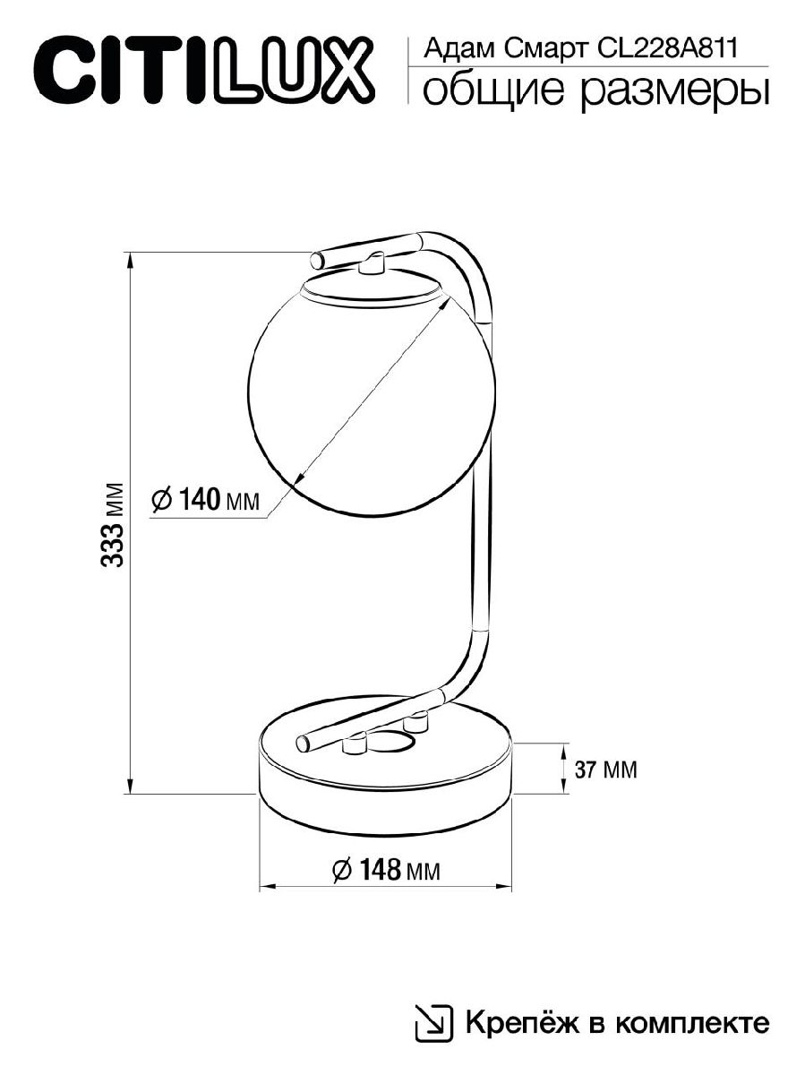 Перечислим технические характеристики настольной лампы Citilux Адам Смарт CL228A811. Тип цоколя — LED. Общая мощность лампы — 14 Ватт. Высота люстры — 335 мм. Степень защиты — IP20, что обеспечивает защиту от проникновения предметов размером более 12 мм и защиту от капель воды, падающих под углом более 15 градусов. Настольная лампа Citilux Адам Смарт CL228A811 — часть коллекции Адам Смарт. Плафон люстры имеет форму шара и выполнен в белом цвете.