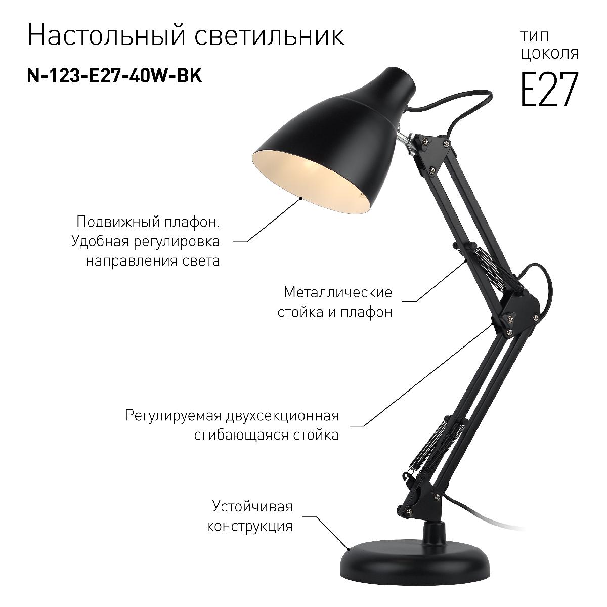 Перечислим технические характеристики настольной лампы ЭРА N-123-Е27-40W-BK Б0047197. Тип цоколя — E27. Общая мощность лампы — 40 Ватт. Высота люстры — 550 мм. Степень защиты — IP20, что обеспечивает защиту от проникновения предметов размером более 12 мм и защиту от капель воды, падающих под углом более 15 градусов. Настольная лампа ЭРА N-123-Е27-40W-BK Б0047197 — часть коллекции N-123. Плафон люстры имеет форму конуса и выполнен в черном цвете.