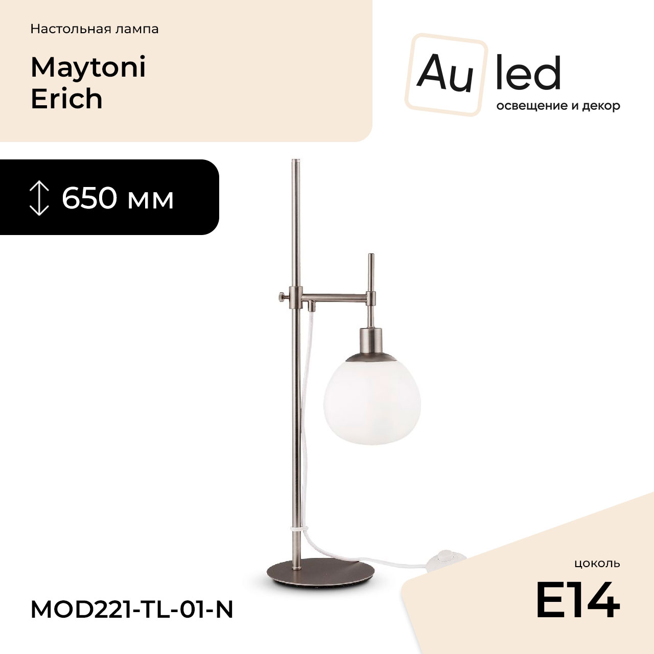 Перечислим технические характеристики настольной лампы Maytoni Erich MOD221-TL-01-N. Тип цоколя — E14. Общая мощность лампы — 40 Ватт. Высота люстры — 650 мм. Степень защиты — IP20, что обеспечивает защиту от проникновения предметов размером более 12 мм и защиту от капель воды, падающих под углом более 15 градусов. Настольная лампа Maytoni Erich MOD221-TL-01-N — часть коллекции Erich. Плафон люстры имеет форму круга и выполнен в цвете.