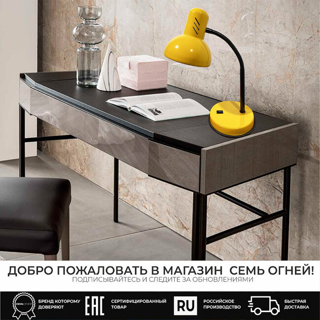 Перечислим технические характеристики настольной лампы Seven Fires Eir 72000.04.45.01. Тип цоколя — E27. Общая мощность лампы — 60 Ватт. Высота люстры — 410 мм. Степень защиты — IP20, что обеспечивает защиту от проникновения предметов размером более 12 мм и защиту от капель воды, падающих под углом более 15 градусов. Настольная лампа Seven Fires Eir 72000.04.45.01 — часть коллекции Eir. Плафон люстры имеет форму полукруга и выполнен в желтом цвете.