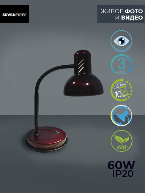 Перечислим технические характеристики настольной лампы Seven Fires Eir 72000.04.57.01. Тип цоколя — E27. Общая мощность лампы — 60 Ватт. Высота люстры — 410 мм. Степень защиты — IP20, что обеспечивает защиту от проникновения предметов размером более 12 мм и защиту от капель воды, падающих под углом более 15 градусов. Настольная лампа Seven Fires Eir 72000.04.57.01 — часть коллекции Eir. Плафон люстры имеет форму полукруга и выполнен в красном цвете.