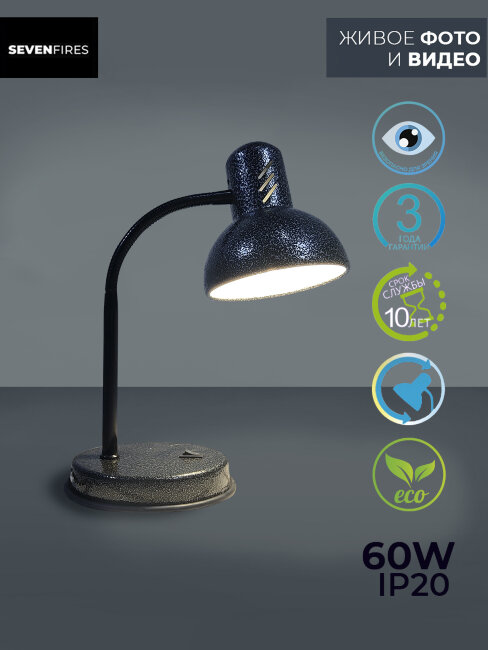 Перечислим технические характеристики настольной лампы Seven Fires Eir 72000.04.74.01. Тип цоколя — E27. Общая мощность лампы — 60 Ватт. Высота люстры — 410 мм. Степень защиты — IP20, что обеспечивает защиту от проникновения предметов размером более 12 мм и защиту от капель воды, падающих под углом более 15 градусов. Настольная лампа Seven Fires Eir 72000.04.74.01 — часть коллекции Eir. Плафон люстры имеет форму полукруга и выполнен в черном цвете.