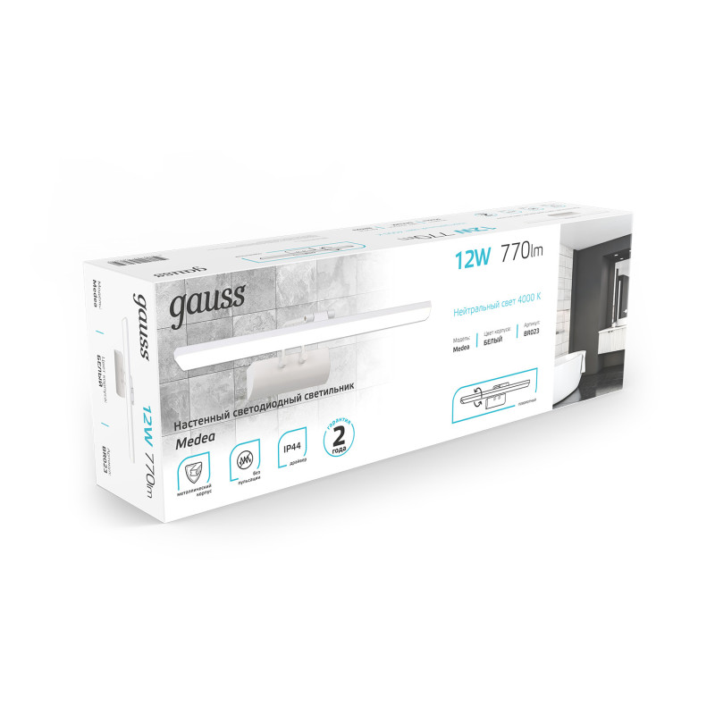 Перечислим технические характеристики подсветки для зеркал Gauss Medea BR023. Тип цоколя — LED. Общая мощность лампы — 12 Ватт. Высота люстры — 100 мм. Степень защиты — IP44, что обеспечивает защиту от проникновения предметов размером более 12 мм и защиту от капель воды, падающих под углом более 15 градусов. Подсветка для зеркал Gauss Medea BR023 — часть коллекции MEDEA. Плафон люстры имеет форму Прямоугольный и выполнен в белом цвете.