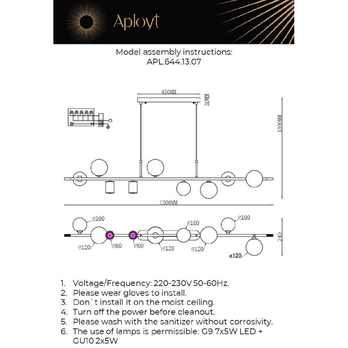 Перечислим технические характеристики подвесной люстры Aployt Klaudia APL.644.13.07. Тип цоколя — G9. Общая мощность лампы — 55 Ватт. Высота люстры — 1400 мм. Степень защиты — IP20, что обеспечивает защиту от проникновения предметов размером более 12 мм и защиту от капель воды, падающих под углом более 15 градусов. Подвесная люстра Aployt Klaudia APL.644.13.07 — часть коллекции Klaudia. Плафон люстры имеет форму шара и выполнен в белом цвете.