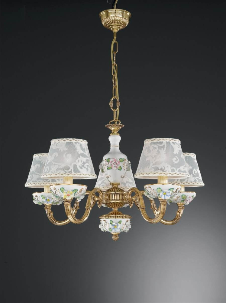 Перечислим технические характеристики подвесной люстры Reccagni Angelo L 9100/5. Тип цоколя — E14. Общая мощность лампы — 300 Ватт. Высота люстры — 410 мм. Степень защиты — IP20, что обеспечивает защиту от проникновения предметов размером более 12 мм и защиту от капель воды, падающих под углом более 15 градусов. Подвесная люстра Reccagni Angelo L 9100/5 — часть коллекции 9100. Плафон люстры имеет форму конуса и выполнен в белом цвете.