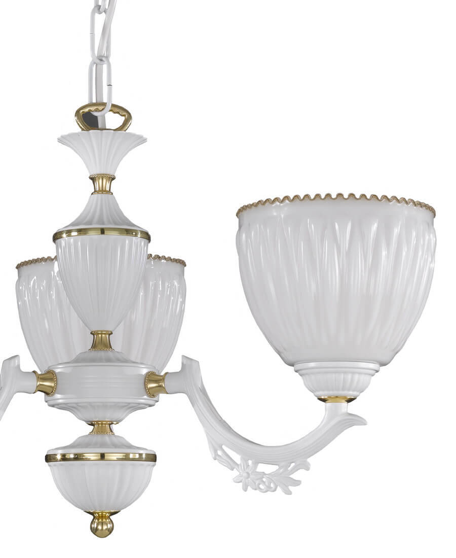 Перечислим технические характеристики подвесной люстры Reccagni Angelo L 9651/3. Тип цоколя — E27. Общая мощность лампы — 180 Ватт. Высота люстры — 280 мм. Степень защиты — IP20, что обеспечивает защиту от проникновения предметов размером более 12 мм и защиту от капель воды, падающих под углом более 15 градусов. Подвесная люстра Reccagni Angelo L 9651/3 — часть коллекции 9651. Плафон люстры имеет форму и выполнен в белом цвете.