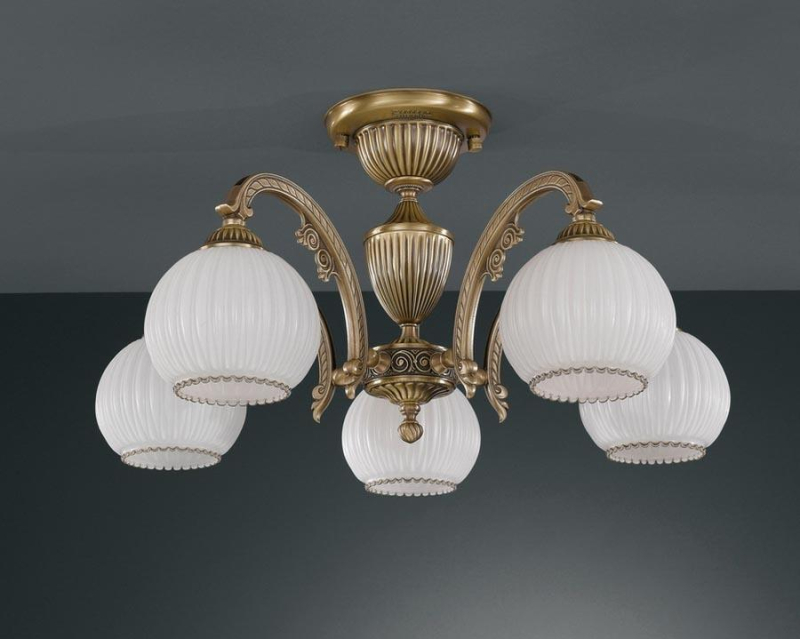 Перечислим технические характеристики потолочной люстры Reccagni Angelo PL 8720/5. Тип цоколя — E27. Общая мощность лампы — 300 Ватт. Высота люстры — 300 мм. Степень защиты — IP20, что обеспечивает защиту от проникновения предметов размером более 12 мм и защиту от капель воды, падающих под углом более 15 градусов. Потолочная люстра Reccagni Angelo PL 8720/5 — часть коллекции 8720. Плафон люстры имеет форму круга и выполнен в белом цвете.