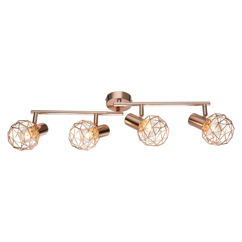 Перечислим технические характеристики спота Globo Xara 54805-4. Тип цоколя — E14. Общая мощность лампы — 160 Ватт. Высота люстры — 180 мм. Степень защиты — IP20, что обеспечивает защиту от проникновения предметов размером более 12 мм и защиту от капель воды, падающих под углом более 15 градусов. Спот Globo Xara 54805-4 — часть коллекции Xara. Плафон люстры имеет форму призмы и выполнен в медного цвете.