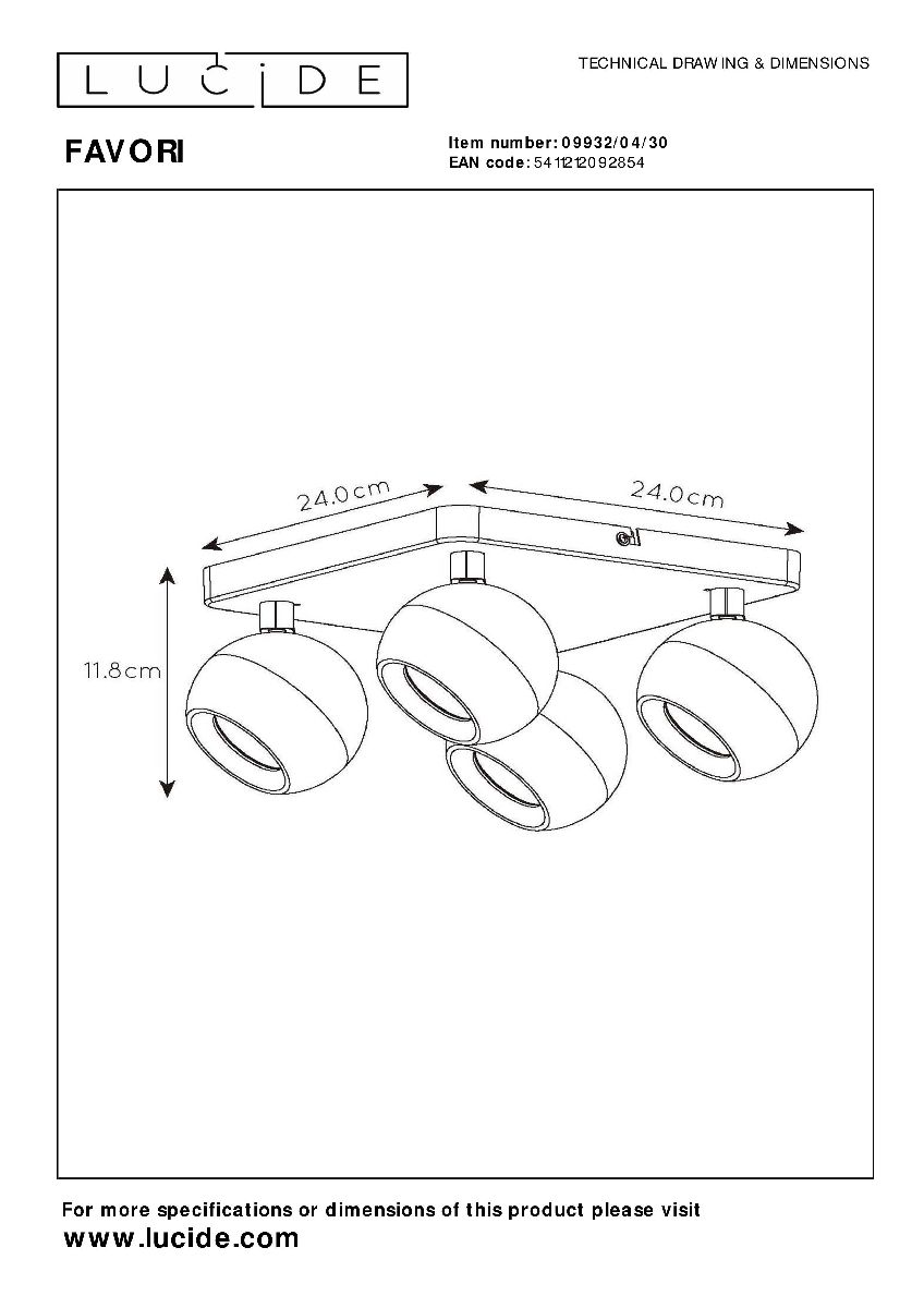 Перечислим технические характеристики спота Lucide Favori 09932/04/30. Тип цоколя — GU10. Общая мощность лампы — 20 Ватт. Высота люстры — 118 мм. Степень защиты — IP20, что обеспечивает защиту от проникновения предметов размером более 12 мм и защиту от капель воды, падающих под углом более 15 градусов. Спот Lucide Favori 09932/04/30 — часть коллекции Favori. Плафон люстры имеет форму шара и выполнен в черном цвете.